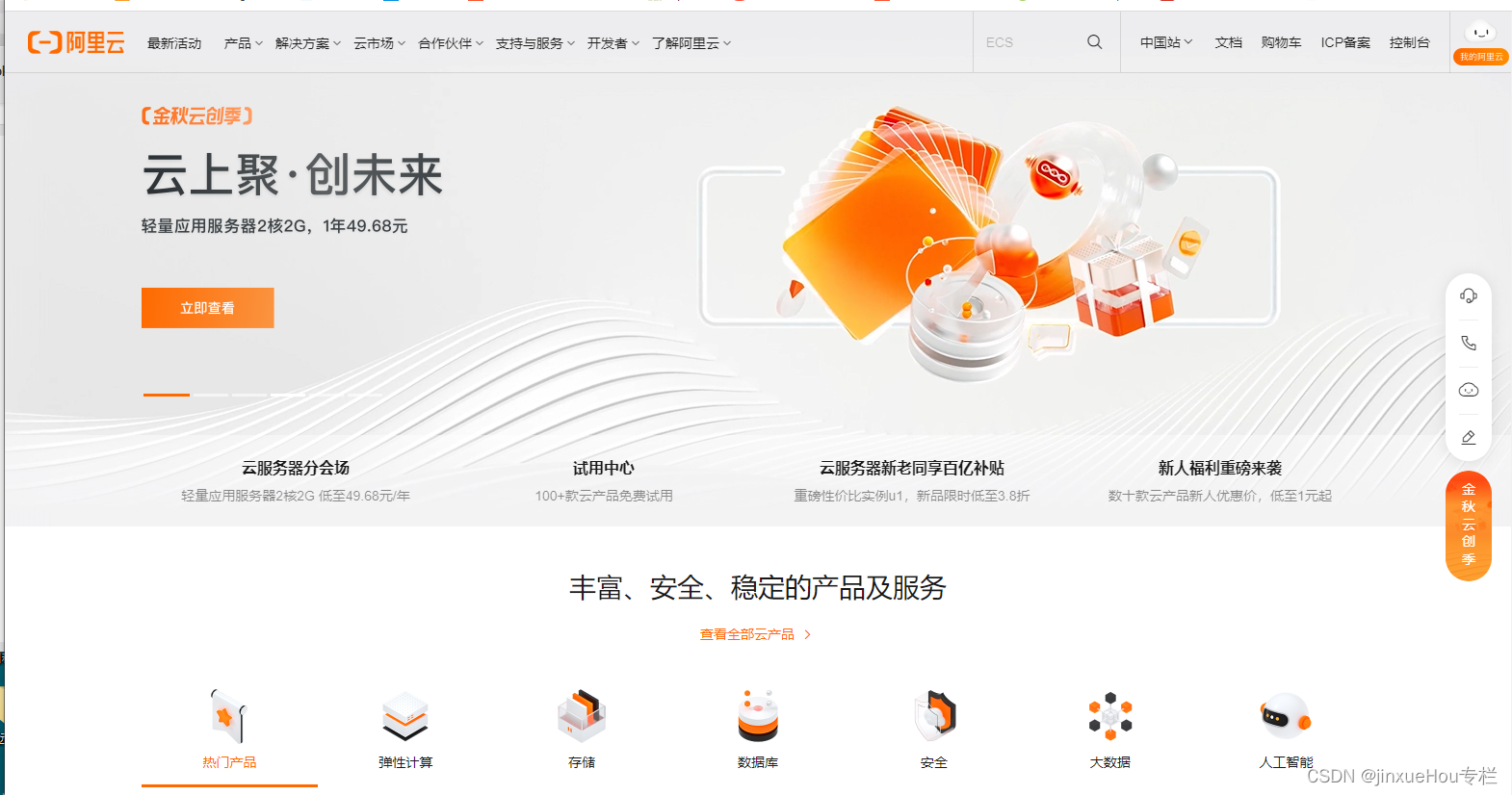 在网上搜索“阿里云”,进入阿里云官网,如下: