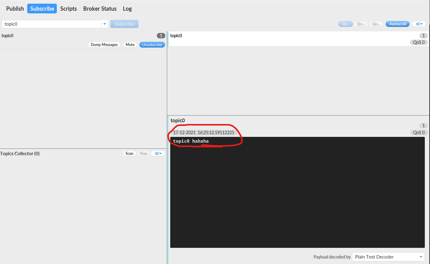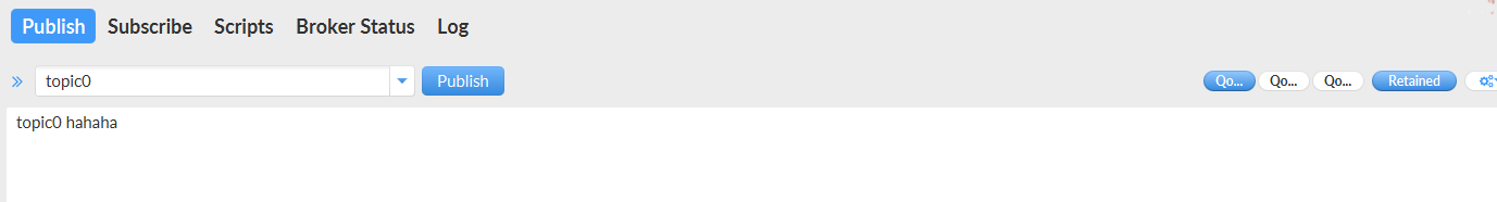 切换到PUblic界面,发布一条上一步中订阅的主题为“topic0”的消息;消息内容为“topic0 hahaha”;Qos同样设置为Qos0。