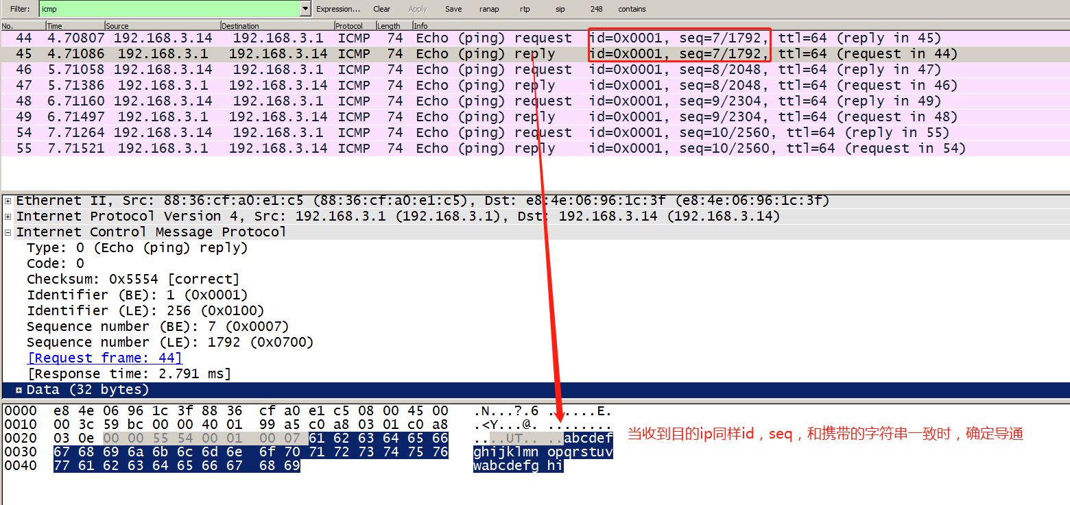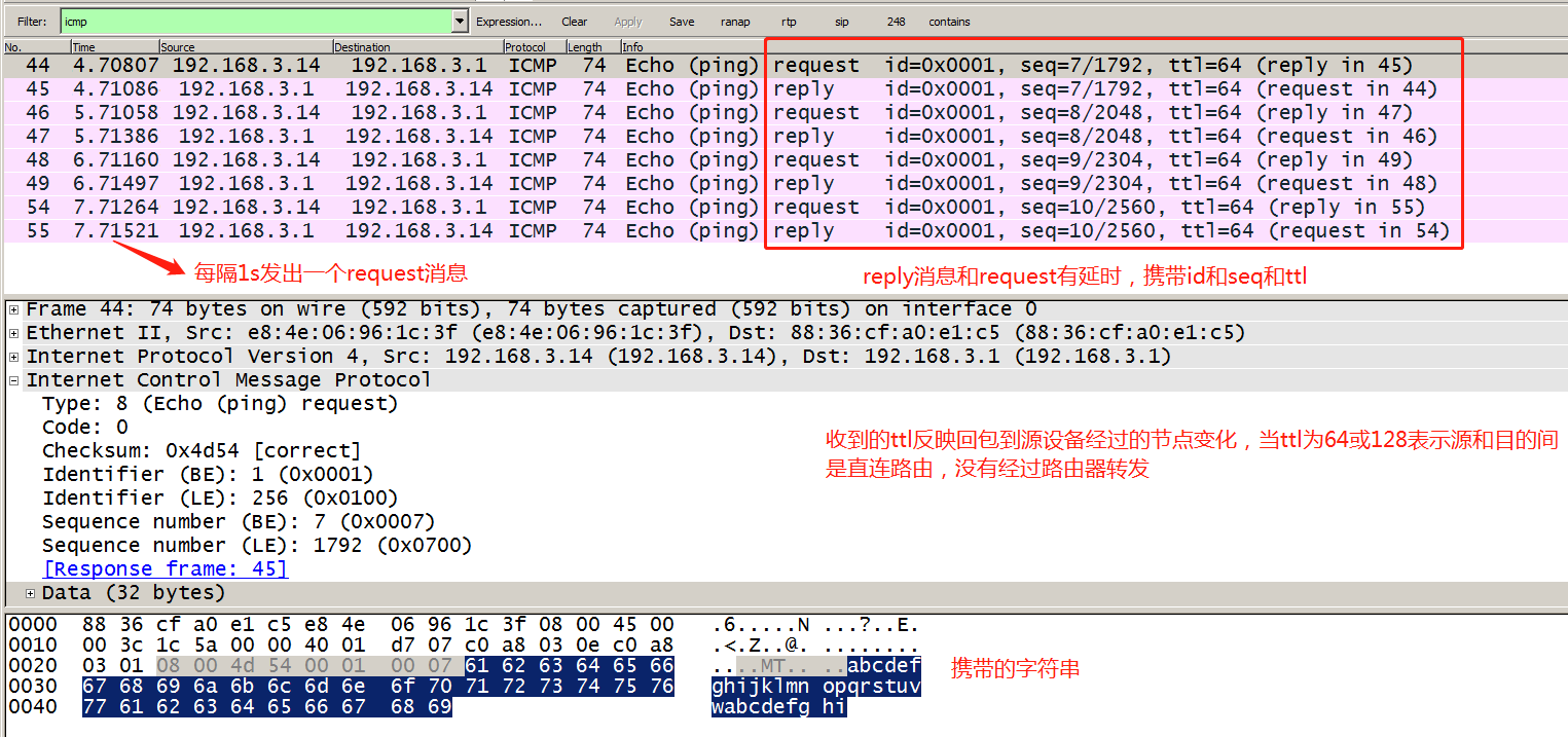 ping命令是执行icmp协议的一个探查网络通断的命令,就是源设备发出一串字母ping的request消息,携带标识码id和序列码seq,字符串如abcdefgh等参数,经过网络节点到达目的设备,目的设备把收到这串字母通过ping的reply消息,携带原来id和序列号seq字符串bcdefgh发给源侧ip地址。源侧收到后,比较参数一致就正常导通打印有对端ip,探查字符串长度,时延,回包ttl,和统计数据。。如目的侧网关发现有问题,或者源本地有问题,就会打印错误,若源侧发出request但没有收到reply侧消息,在定时器超时后就会打印time out。ping消息windows下默认发出四个request,超时定时器5s,正常返回消息后,隔1s发出一个ping的request。发四次。如下图: