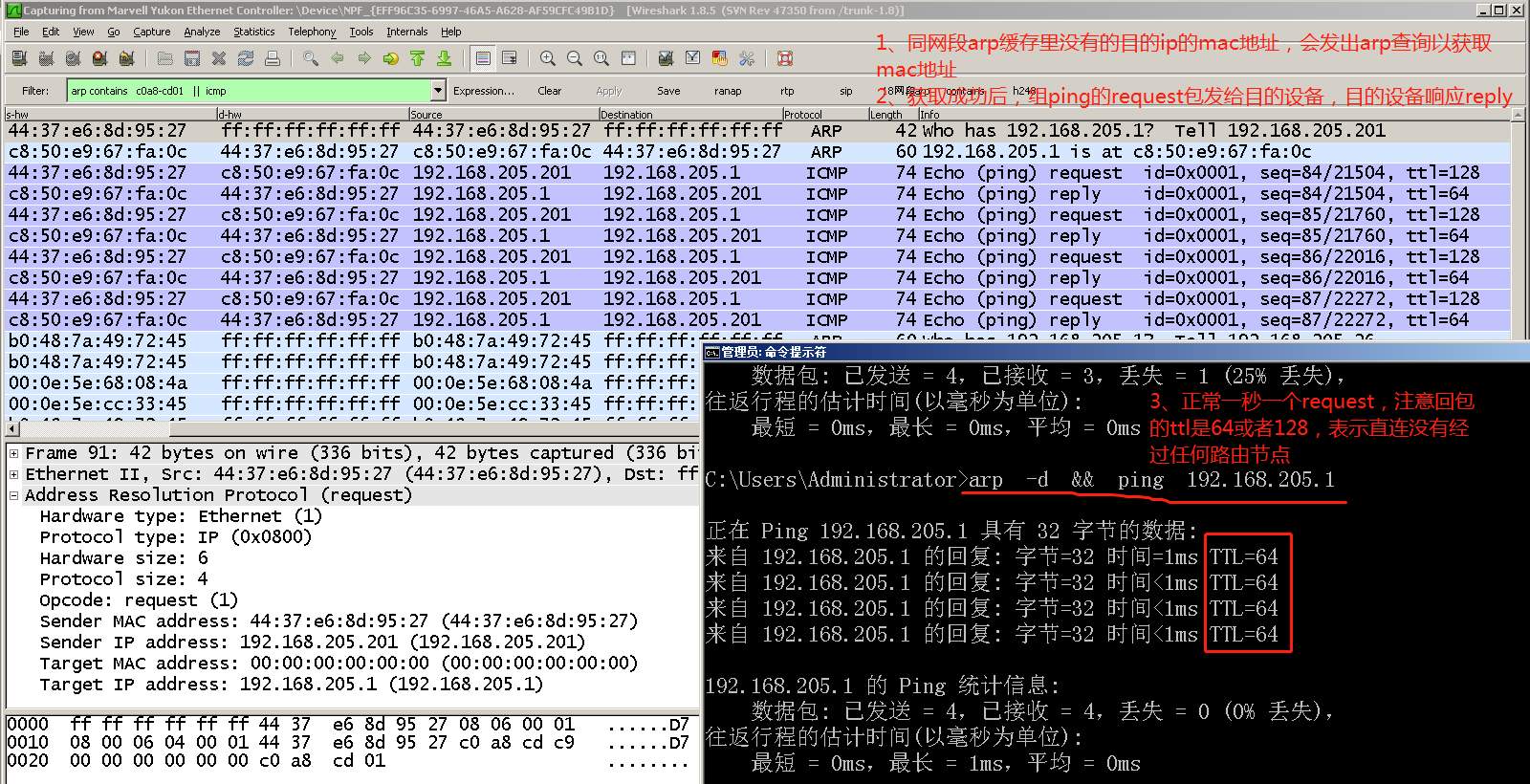 pc的ip192.168.205.201/24,去ping同网段的ip192.168.205 .1,
