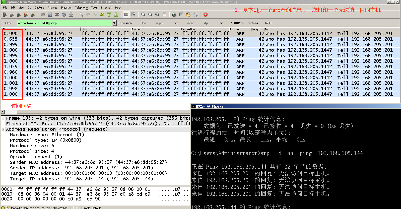 目的主机不可达 destnation host unreachable 目的网络中找不到目的主机,目的网关arp查询目的主机请求没有得到广播域范围内响应。如下图: