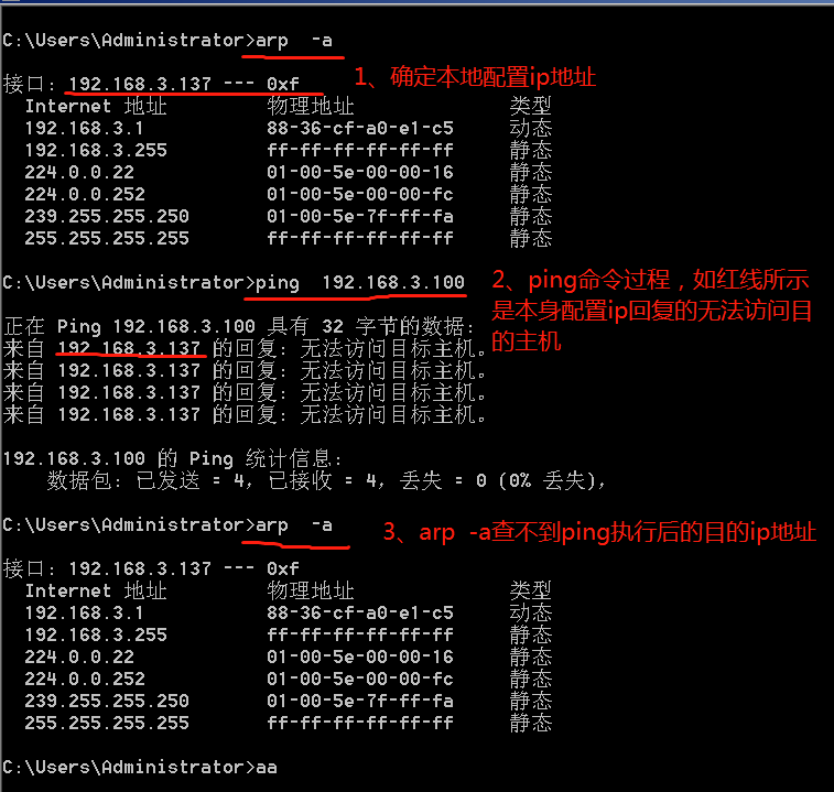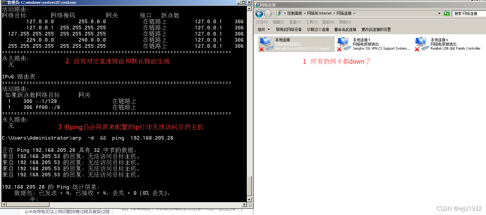 这种情况检查route print检查是否有直连路由生成,网卡状态是否正常。若有直连路由,网卡状态是up的,就是判断目的ip是否符合直连路由,符合直连路由的话,arp -a检查是否存在目的ip的mac地址,没有的话就是ping的request发出前,arp消息查询目的ipmac地址没有得到响应,检查目的ip是否在同一个广播域里,目的ip是否开机,目的ip是否存在等原因。