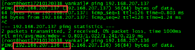 环境pc的ip192.168.207.137可以通,但另一个192.168.207.136不通。ping命令回车后没有任何回显打印。