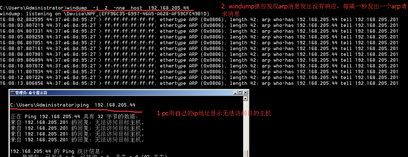 发现,windows系统会用自身ip回复无法访问目标主机,抓包显示去查192.168.205.44的目标ip的mac地址,没有得到响应,每个一秒发一次,发12次。