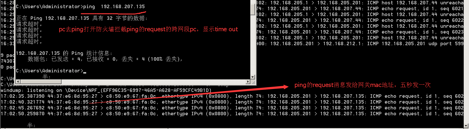 结论:pc去ping跨网段的打开防火墙,拦截ping的request消息的主机,会显示time out的提示,抓包是等待回包5s超时后重新发出request消息。