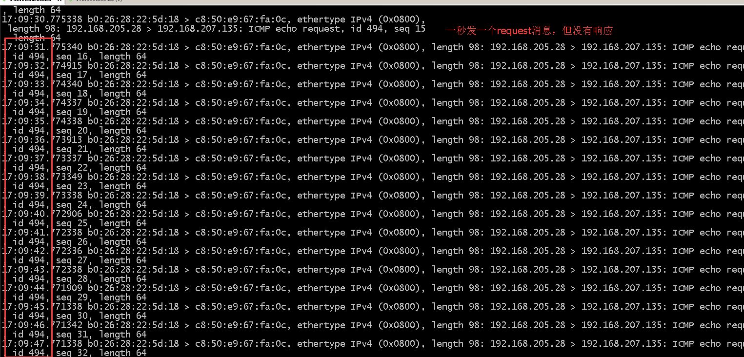 看到arp发出,得到响应后,发出ping的request消息,而ping的界面没有任何回显。