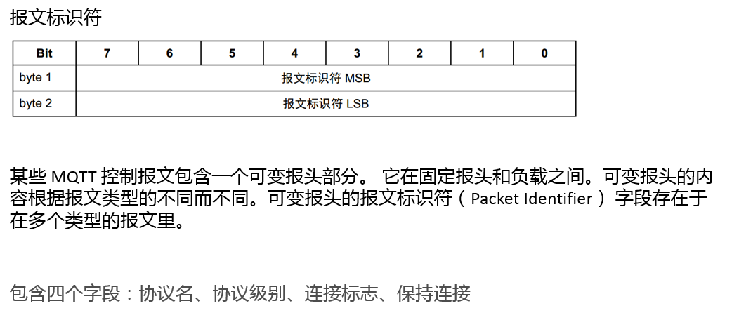 ④ 报文标识符用来区分报文,特别是在重发的报文中用来标识是否是同一个报文,并在需要应答的场景中用于确定是对哪个发送报文的应答。可变报头的报文标识符(Packet Identifier)字段存在于在多个类型的报文里。