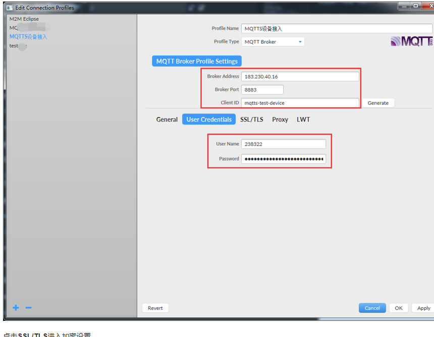 ADDRESS 为固定 183.230.40.16,端口固定 8883,client ID为设备名称(设备列表中),user name 为产品ID(产品概况中),password为上面生成的token
