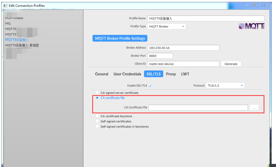 设置证书,点击SSL/TLS,勾选Enable SSL/TLS,选择 CA certificate file,导入证书,证书在全部文档-MQTT物联网套件-设备开发指南-开发指南-服务地址下载,导入后点击OK(记住 PROFILE NAME),返回主页,选择刚才设置的设备( PROFILE NAME),连接,成功后会看到设备在线。