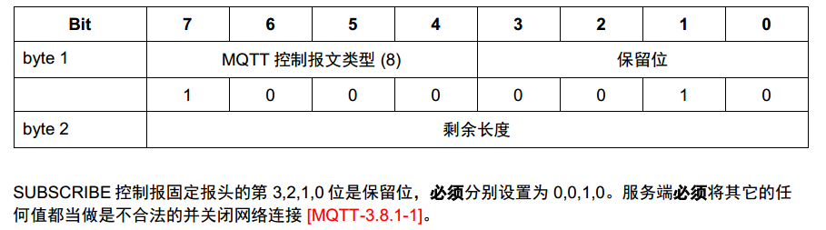 82 : 其中bit7~bit4 :8 对应消息类型为 Subscribe, bit3~bit0: 2 保留位