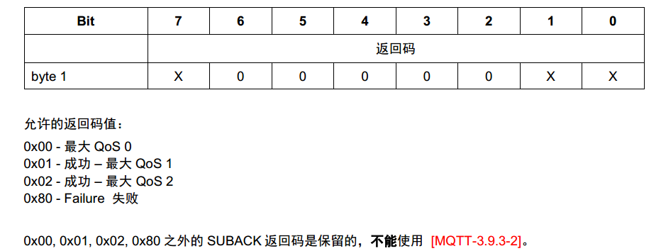 00 :bit7为0,表示成功,bit6~bit4 固定为0; bit3~bit2固定为0; bit1~bit0 : 0 ,表示QoS=0,完全符合我们的设置
