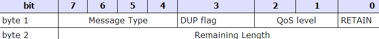 | byte 1 | Message type (2) | DUP flag | QoS flags | RETAIN | |||||
