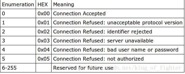 只有0-5目前被使用到,其他值有待日后使用。一般返回值为0x00,表示连接建立。非法的请求,需要返回相应的数值。
