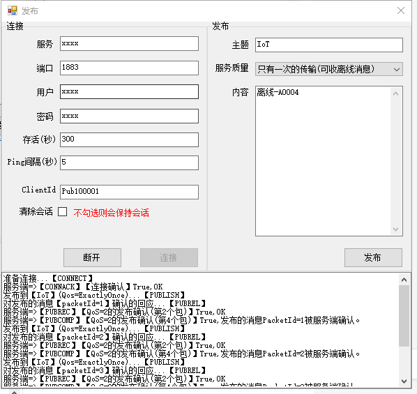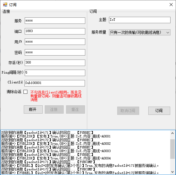 但在用C#实现的过程中,连接已经正常了,QoS也设置为2了,就是收不到离线的消息。后来发现,问题不是出现在协议上,而是在数据的接收上。在接收数据时,用socket.Receive来接收,在连接的时候,会返回数据,而接收的buff开的较大,则会在接收到服务端对connect回应的数据包外,也会把离线的数据也一起收起来。这时就要按协议来作解包处理了。如果没有作解包处理,则对收到的connect的conack命令处理,那后面的离线数据就会丢失了。