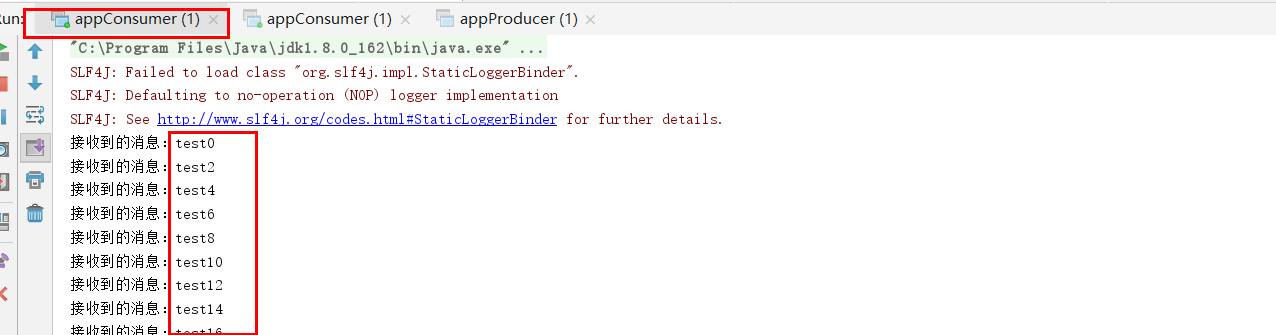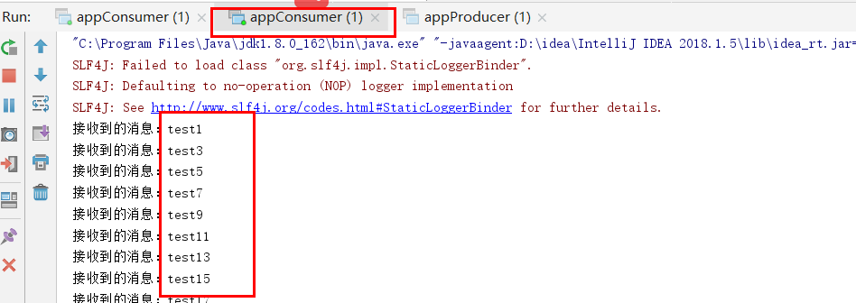 9.看看两个消费者的控制台,如下两张图:其中一个消费接收到的全是奇数的消息,而另一个接收到的都是偶数的消息。