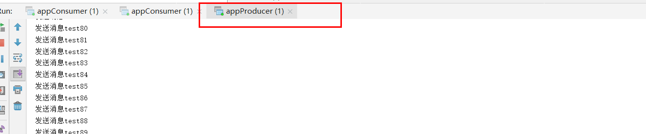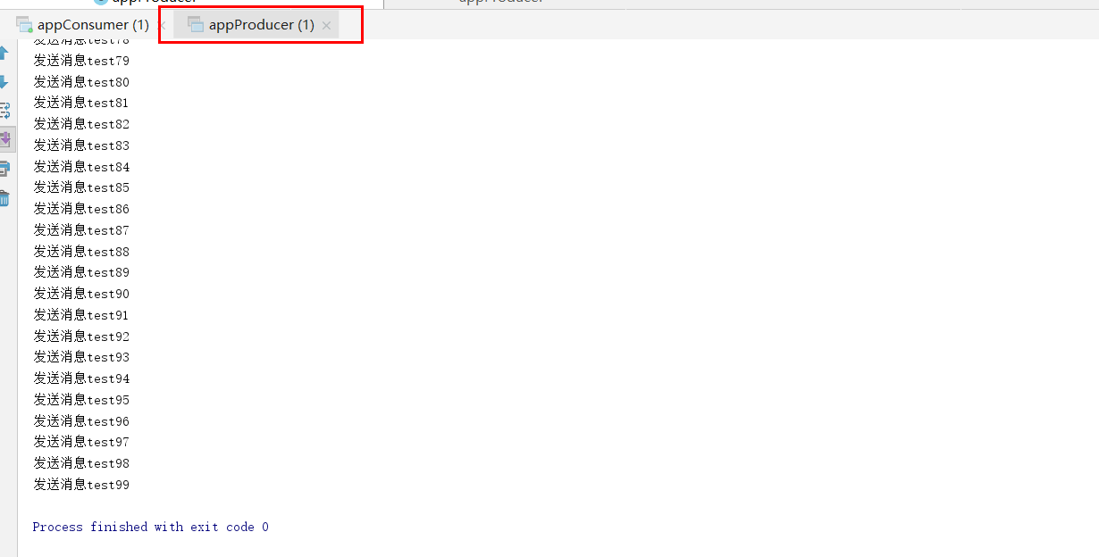 接着启动生产者的java类,观察控制台,如下图:生产了一百条消息。