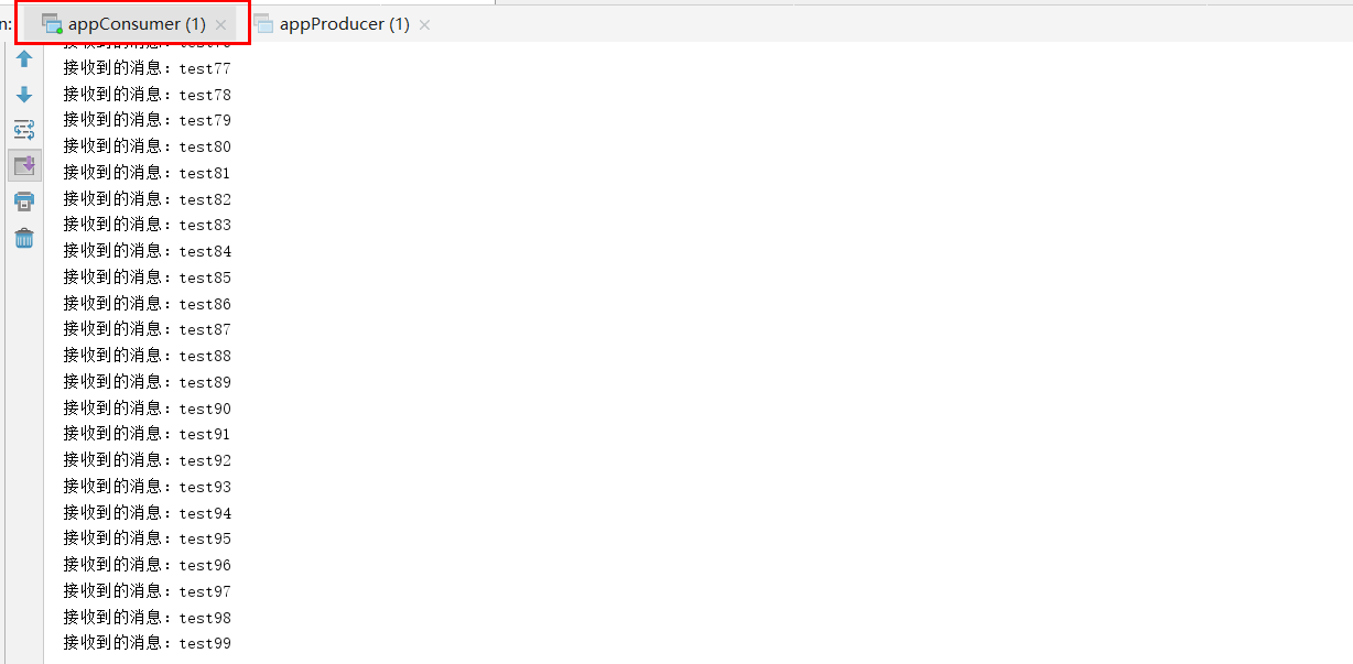 此时切换至消费的控制台,观察控制台,如下图:已经打印出了一百条消息了,说明消费者已经接受到全部一百条消息。