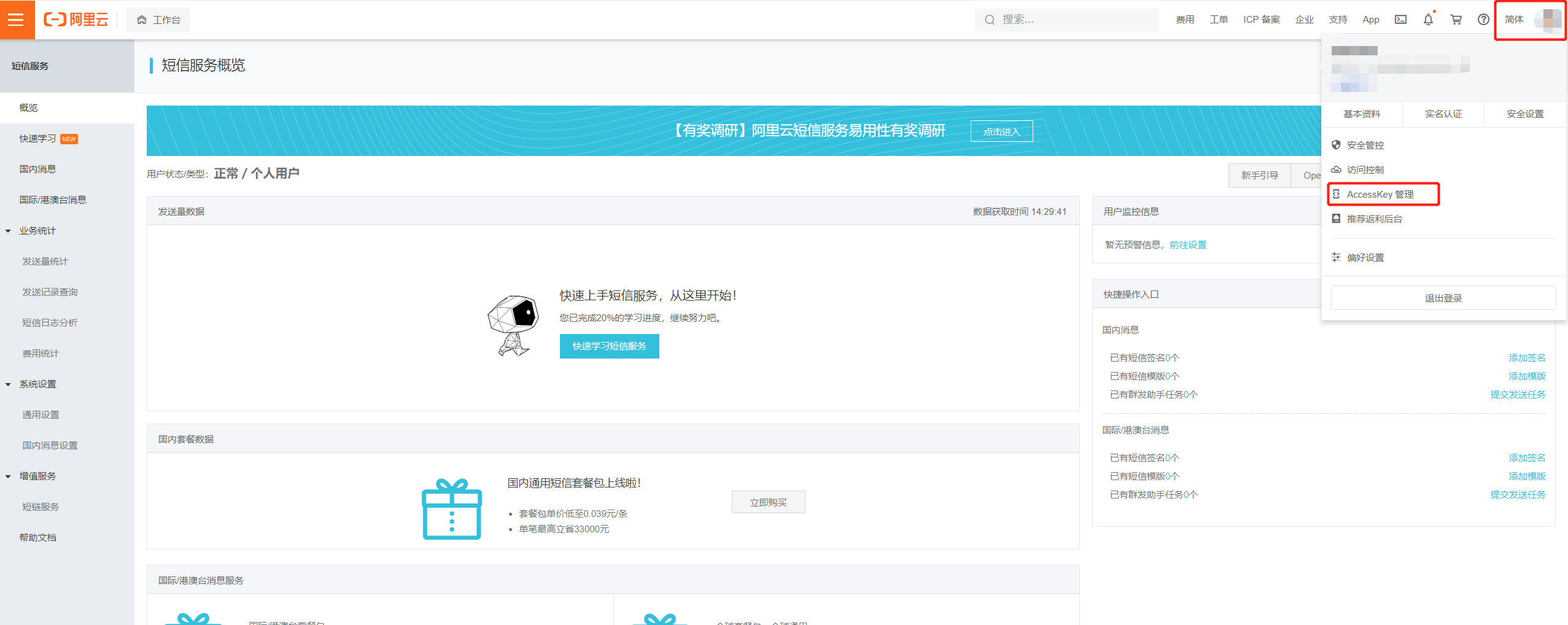 工作台头像弹框中AccessKey管理查看。