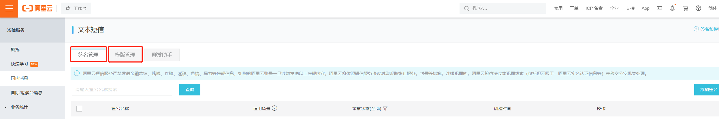 2,开通短信业务后,添加签名和模板。