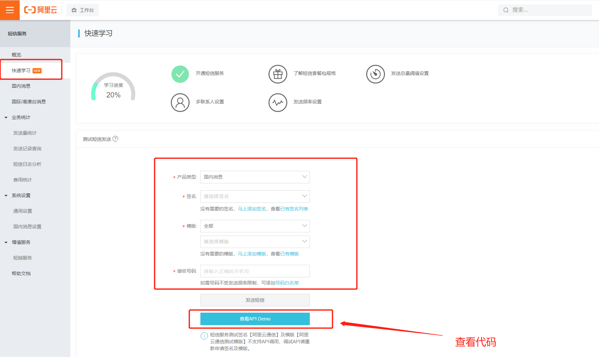 3,添加完签名和模板,并且审核完成后, 可以在工作台的快速学习进行测试发送,查看测试结果。并且可以查看相关代码。