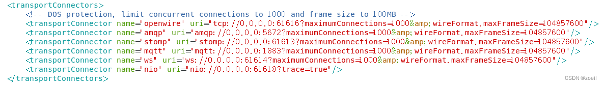 其中配置Transport Connector的文件在ActiveMQ安装目录的conf/activemq.xml中的<transportConnectors>标签之内。