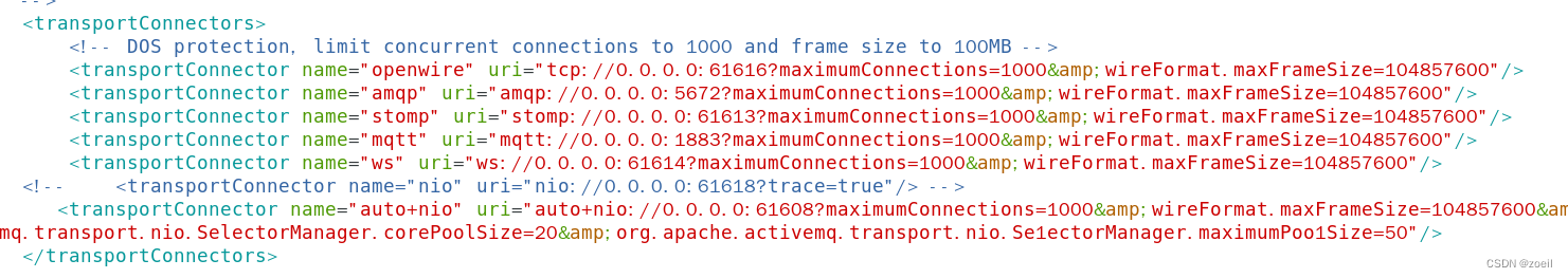 <transportConnector name="auto+nio" uri="auto+nio://0.0.0.0:61608?maximumConnections=1000&wireFormat.maxFrameSize=104857600&org.apache.activemq.transport.nio.SelectorManager.corePoolSize=20&org.apache.activemq.transport.nio.Se1ectorManager.maximumPoo1Size=50"/>