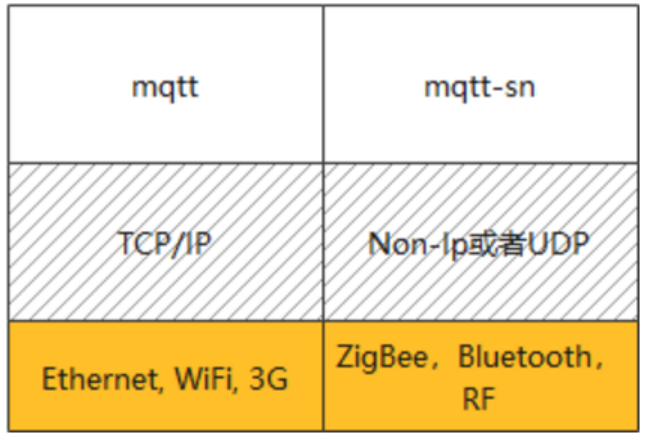 MQTT协议是由IBM公司在1999年提出的,截至到目前一共有5个正式版本,其中最新的版本是v5。在这5个版本中有一个特殊的版本,即专门应用于传感器网络的MQTT-SN,该版本主要应用在传感器等资源受限的场景,很难在传感器上支持tcp协议,为了入网也会有特殊的设备和架构。两者的差异如下图所示。
