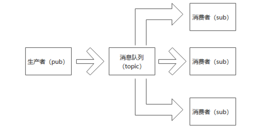 消息队列(MQ)是一种非常常见的异步分发和处理模型,有着广泛的应用。其基本构成是生产-转存-消费[1],也就是生产者产生消息,然后在队列中进行缓存,再由消费者从队列中取消息,这是一种最简单的点对点的场景。还有一种点对多点的场景,即需要将一份消息分发给多个消费者(类似于网络通信中的组播),这就是我们的这里提到的发布/订阅模型。所谓的发布/订阅模型本质上也是由生产者负责发布消息,只不过这个消息增加了一个topic主题,并且缓存在队列中,这样就可以有多个消费者同时订阅这个主题。详细的过程如下图所示。