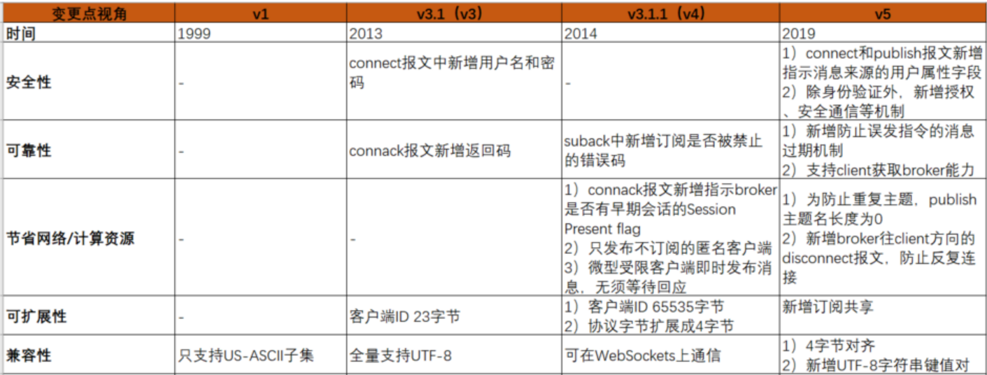 主流MQTT协议各个版本的差异进行分析,如下表所示。各个版本基本上都是围绕上面的6个维度去变化的。安全性上来讲主要是引入一些新的鉴权机制,同时在信息来源上做到可以溯源,安全一直是物联网的一个痛点,作为物联网事实上的标准协议,MQTT后续也会在安全性方面有更多的考虑。可靠性方面主要是保证通信双方在发生异常时,能够得到反馈,是因为能力不支持还是网络异常导致的通信问题,从而进行相应地处理。物联网的资源特别是终端侧其实是非常受限的,即使是在网络层上随着接入终端的增多,其资源也是十分宝贵的,因此如何在保证可靠通信的前提下,更合理地分配网络和计算资源也是协议演进要重点考量的点。至于说可扩展性和兼容性则是每种网络协议在往前演进的过程中都需要考虑的,要能保证在不同的平台上,不同的应用场景下,都可以灵活地扩展和使用。