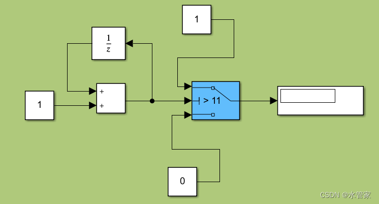 利用自加1进行每个周期加一的值,将10个周期之后的运行结果利用Switch进行判断,如果满足判定条件则输入1,否则输出0。