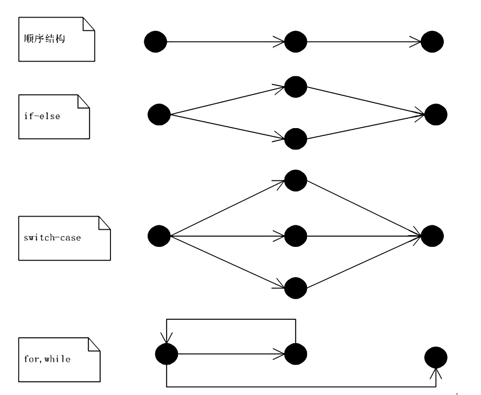 圈复杂度主要与分支语句(if、else、,switch 等)的个数成正相关。可以在图1中看到常用到的几种语句的控制流图(表示程序执行流程的有向图)。当一段代码中含有较多的分支语句,其逻辑复杂程度就会增加。在计算圈复杂度时,可以通过程序控制流图方便的计算出来。