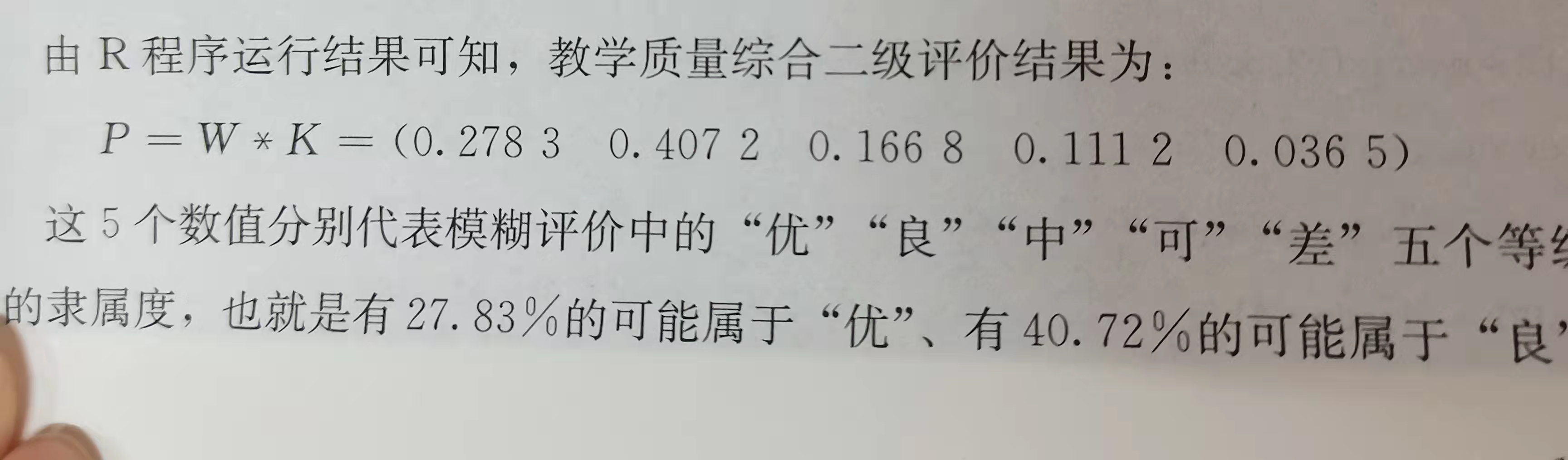 #运用模糊隶属度矩阵R/K与各层次判断矩阵权重W,求模糊评价