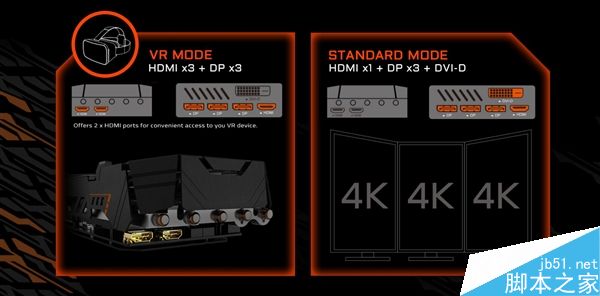 不过,非常意外的是,在对侧,技嘉又设计了两个HDMI接口。这可不是什么工程卡或者为了6联屏,作用应该是连接VR扩展外设。