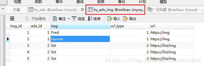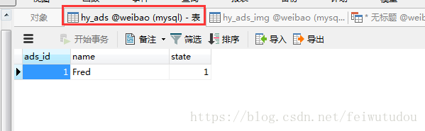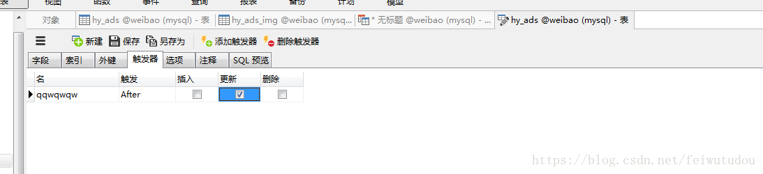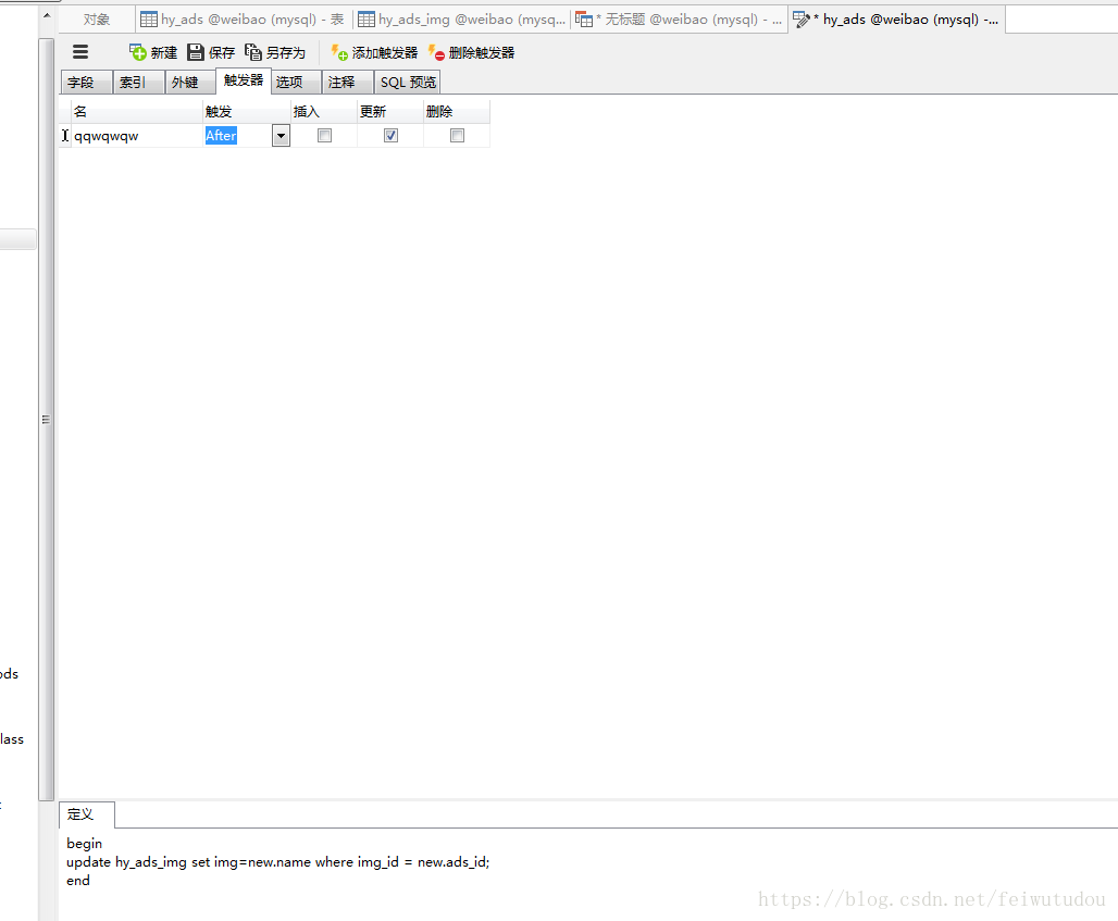 这两张表中,hy_ads是主表,hy_ads_img是从表,在实际的业务中,主表hy_ads如有改变,那么hy_ads_img也会有相应的变化,我们这里先对hy_ads创建触发器;