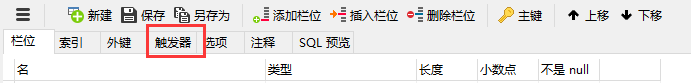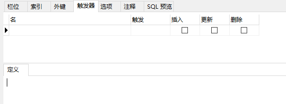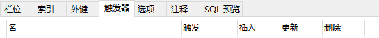 2、名为触发器名称;触发分after和before两种,很明显的为在操作之前还是之后触发操作;插入、更新、和删除对应触发器触发的条件,选择其中的一种使用