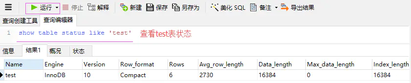 SHOW TABLE STATUS查看当前数据库中所有表的信息状态。- 查看当前数据库中指定表的触发器(show triggers from test)
