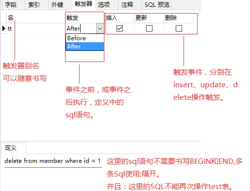 这里会在test插入数据的时候执行定义中语句,并删除member表的第一行数据。