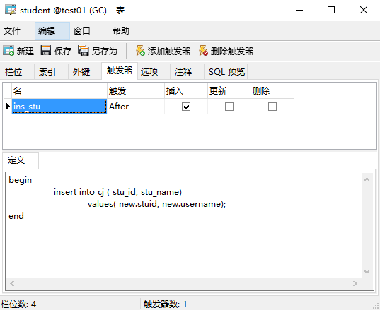 注意:创建触发器和表一样,建议增加判断:DROP TRIGGER IF EXISTS `ins_stu`;