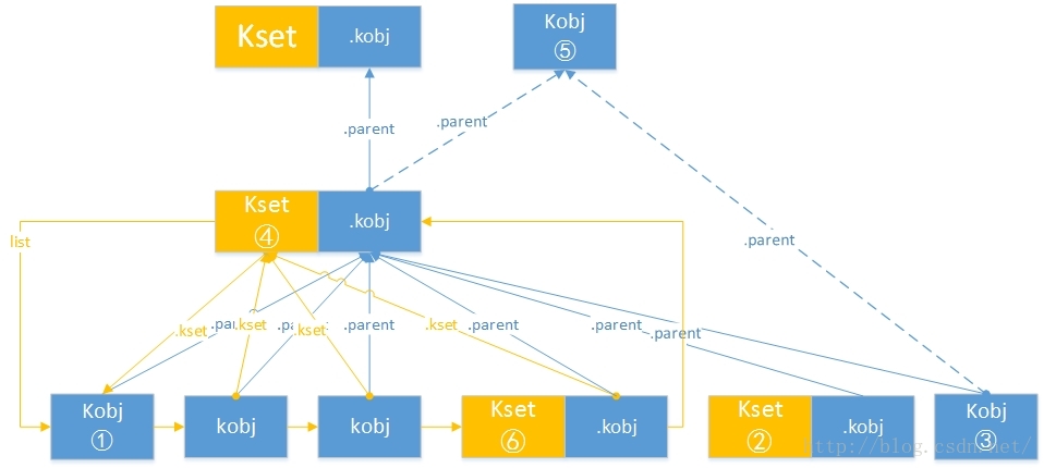 如下图:黄色代表Kset 蓝色代表Kobject