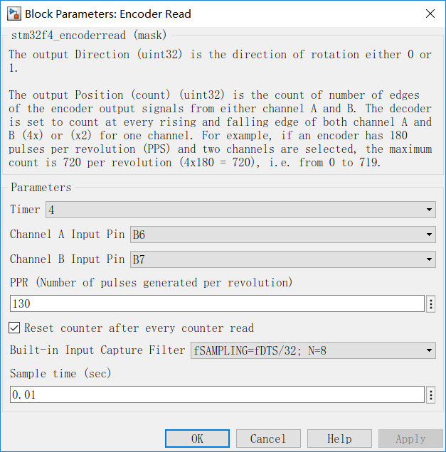 Sample time:多少时间读取一次数据(因为这里并不是定时器的精准定时,亲测0.01秒比较稳定,可以利用Timer-IRQ实现精准时间读取数据)