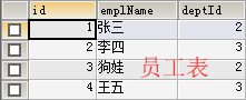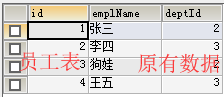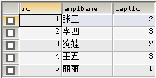 1 -- 向员工表中添加一条数据 2 INSERT INTO employee VALUES(5,'丽丽',1);