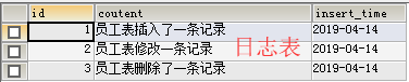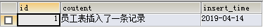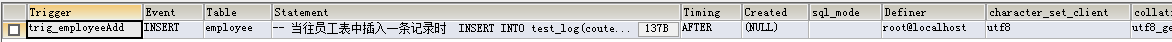 1 -- 创建触发器 2 CREATE TRIGGER trig_employeeAdd AFTER INSERT ON employee FOR EACH ROW -- 当往employee表中插入一条记录后,触发触发器trig_employeeAdd自动向test_log表中插入一条数据 3 INSERT INTO test_log(coutent,insert_time) VALUES('员工表插入了一条记录',CURDATE());