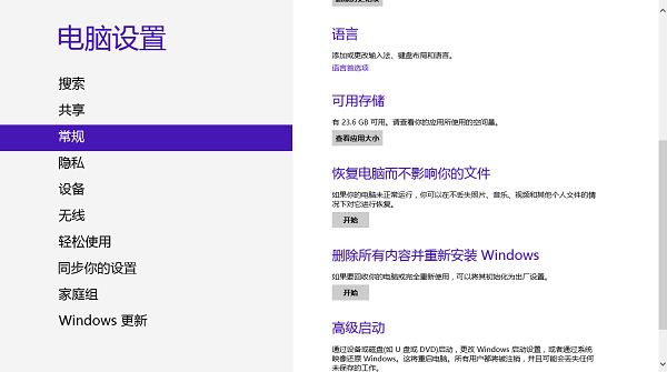 具体操作分为两种,一种是用户可以在不关机的情况下直接在系统中进行还原操作。在磁贴界面下点选“电脑设置”选项,在常规一栏下,有恢复电脑而不影响你的文件和删除所有内容并重新安装Windows两个分支功能,用户可以根据自己的需求来选择两个功能哪个更适合你还原的目的。