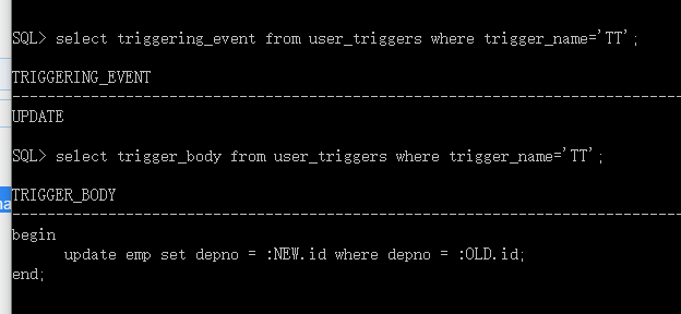 SQL> select trigger_body from user_triggers where trigger_name='TT';