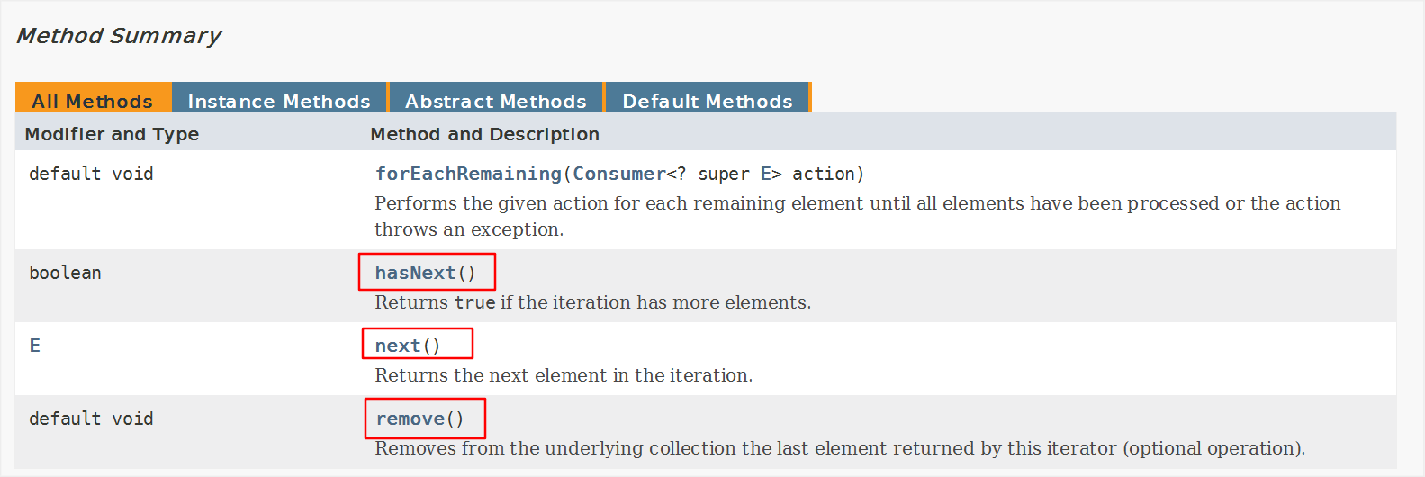 Iterator接口的方法: