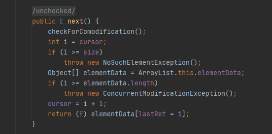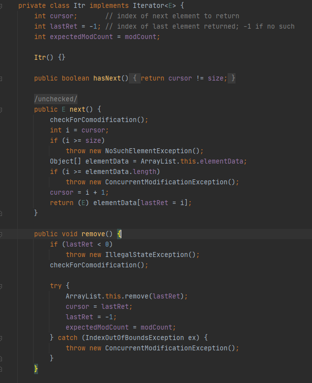 如果在遍历过程中,对数组进行了add()或者remove()等会导致modCount改变的方法,那么就会报错,这个判断的意义就在于,使用迭代器遍历时,不允许外部操作数组,而内部类Itr其实也提供了一个remove()方法,这个方法在操作数组的时候会更新expectedModCount和modCount的值,所以如果需要在遍历时操作数组,可以调用Itr的内部方法