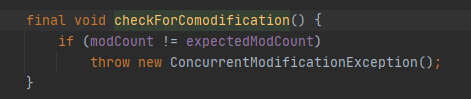 进入方法,第一部先检查修改次数checkForComodification(),源码如下: