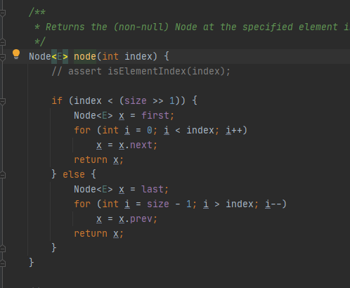 在链表结构中,因为内存地址的不连续性,所以要找到某一个节点的位置,必须从头或者从尾遍历,在java中,链表会根据下标的大小,决定要么从头遍历,要么从尾遍历,时间复杂度为O(n)