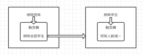 仔细想想,我们将在案例中有两个是同一个表中的删除触发器。删除班级的触发器中定义的是删除班级时触发删除学生,而删除学生的触发器中定义的是班级人数减一。你发现了没,触发器被连着触发了。如下变化: