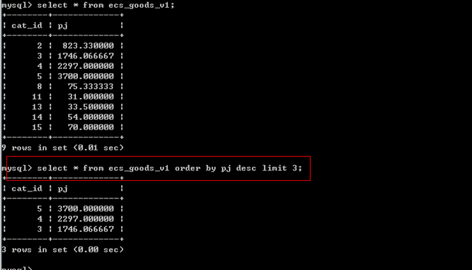 select cat_id,avg(shop_price) as pj from ecs_goods group by cat_id order by pj desc limit 3;